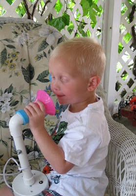 Here, Grandpa Bruce and Deacon went to the utility area of the backyard so they would be far away from the speakers at the other end of the line.